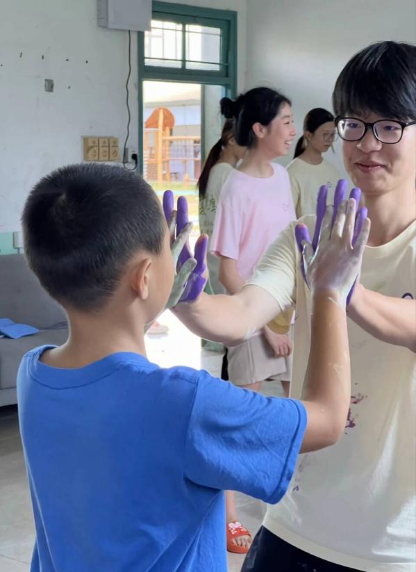 繪畫藝術治療是以繪畫藝術活動為手段,對身心障礙者進行輔助性治療的方法,幫助孤獨癥兒童穩定情緒、抒發情感,改善認知能力,建立社會意識和社會適應性。2024年7月21日,“半夏鹿鳴”志愿服務隊與星星的孩子們共同進行了一場“身體繪畫”——腳踩畫和手指畫。志愿者引導孩子們雙手雙腳沾上多彩顏料,在畫布上隨心繪制圖案。