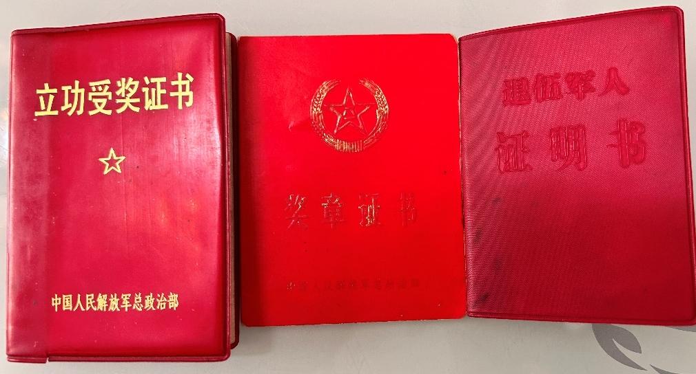 圖為張建付當年立功受獎證書、獎章證書、退伍軍人證明書。楊柄喆供圖