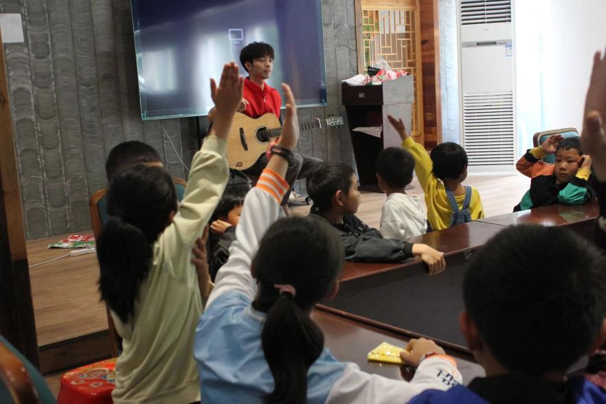 音樂課程由實踐隊成員陳彬和左雪梅進行教學。課程中,團隊成員從音律、歌詞、節(jié)奏等方面指導小朋友們完成《夜空中最亮的星》和《蟲兒飛》兩首歌曲的學習。同時,設(shè)置有趣的提問和上臺表演環(huán)節(jié)促進小朋友們更好地融入課堂氛圍、欣賞音樂之美。