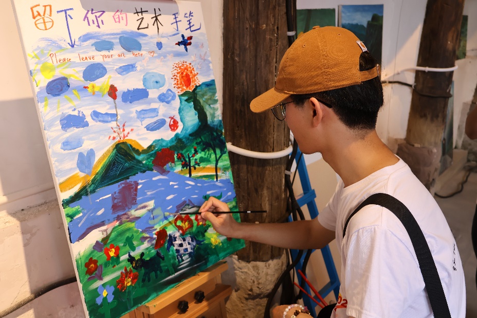 沿著青石板路一路向前,“兩湖會館“出現在實踐團成員眼前。兩湖會館的改造活化,為貞豐古城增添了又一抹亮色。成員們了解到珉谷藝術空間在此連續舉辦多場展覽,從貴州歷代地圖展到拓片展,再到熱成像影像藝術和貞豐青年非遺展。這里不僅是藝術愛好者的天堂,更是記錄與傳播貞豐古城文化的重要平臺。實踐隊成員們駐足于一幅幅精美的作品前,從剪紙、繪畫、扎染等藝術形式中,充分領略到了貞豐青年天馬行空的想象力以及用自己的一技之長建設家鄉的堅定決心。團隊成員們深受感染,也紛紛拿起畫筆,在此留下自己的印記,記錄下這座古城的獨特魅力。