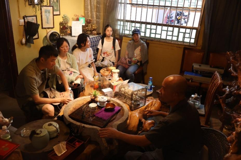 在貞豐,茶文化也是一道亮麗的風景線。實踐團成員來到一間茶葉作坊,對話非物質文化遺產項目坡柳“娘娘茶”制作技藝的縣級代表性傳承人艾恩貴,在親切的交談中體會艾師傅如何用自己的行動詮釋茶文化的傳承與發展。
