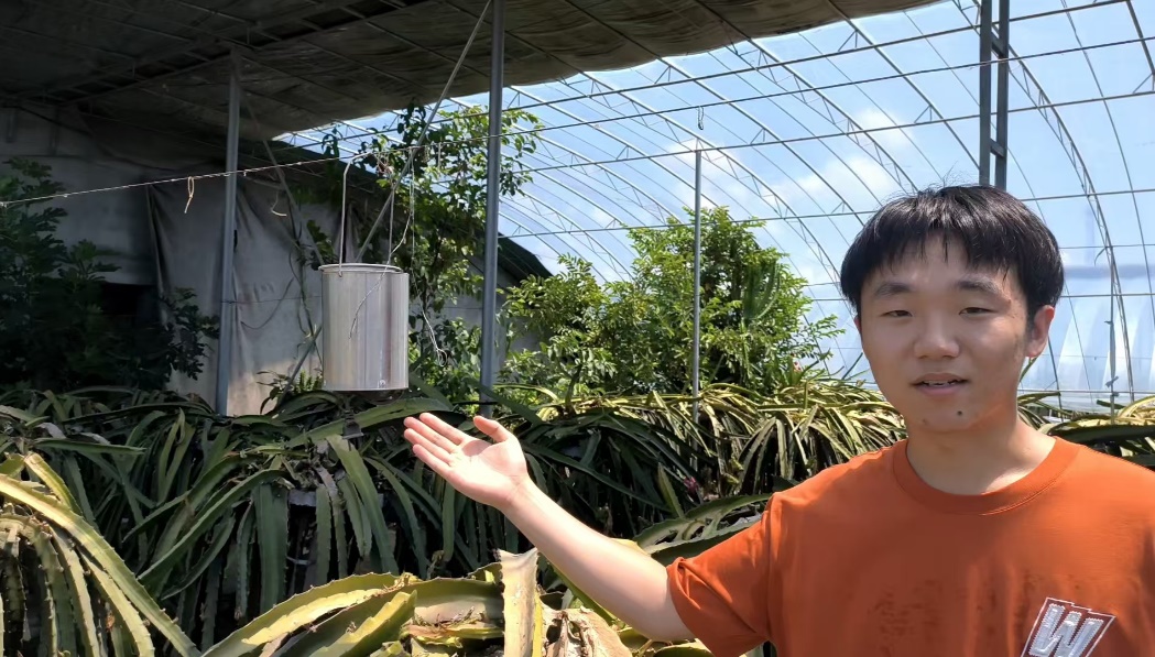 為切身體會農業生產的過程,體驗農民的辛苦,服務團成員主動要求進入大棚,幫助員工采摘火龍果。優質的火龍果是種植園的特色產品,也是其收入的重要支柱產品。火龍果屬于熱帶、亞熱帶水果,對于生長溫度要求較高,大棚內的溫度約為46℃。工作人員耐心為服務團成員講解火龍果的營養價值、生長周期、種植要點等信息。雖在炎炎烈日之下,但每個人都彰顯著青年的蓬勃朝氣,將青春書寫在祖國大地之上,將青春的風采撥散于田間地頭。