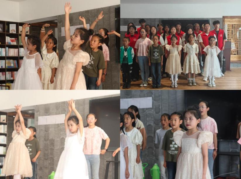 經(jīng)過實踐隊成員們多節(jié)課堂的訓(xùn)練彩排,7月29日下午,小朋友們?yōu)榇蠹規(guī)砹艘粓鼍式^倫的文藝匯演。本次文藝匯演由歌曲節(jié)目《蟲兒飛》、《夜空中最亮的星》、朗誦節(jié)目《彩色的中國》和舞蹈《彩虹節(jié)拍》組成。在小朋友們悠揚的歌聲、激昂的吟誦和靈動的舞姿下,這場文藝盛會得以圓滿落下帷幕。一幀幀歌舞瞬間,孩子們充滿情感的表演和富有活力的姿態(tài)將作品蘊含的溫暖與力量傳遞給每一位觀眾。一聲聲吟誦之下,孩子們鏗鏘有力的朗讀深蘊鄉(xiāng)村振興、民族團結(jié)的憧憬與信心,引起觀眾的共鳴。