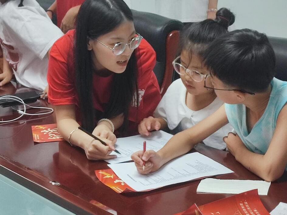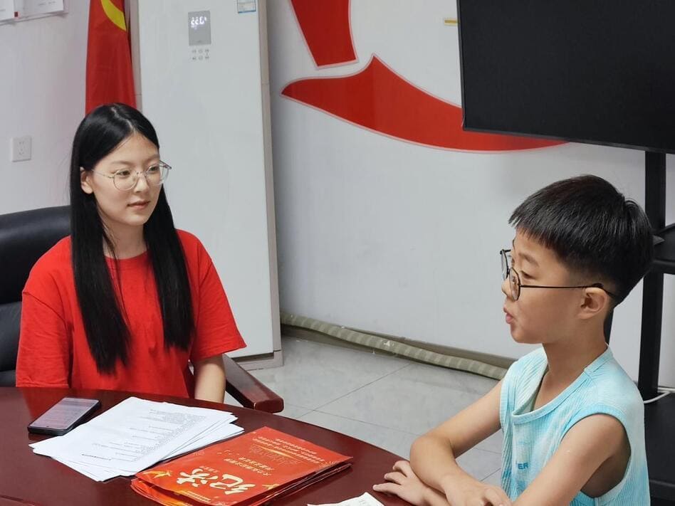 圖為“紀法清風燕趙行”社會實踐隊社會實踐隊在洺湖社區黨群服務中心宣講未成年人積極回答問題 王明瀚攝
