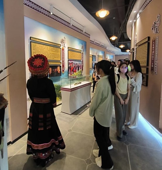 圖為工作人員向實踐團成員們介紹瑤繡講解員向實踐團成員介紹瑤繡的歷史。中國青年網通訊員 鄒欣瑜 攝