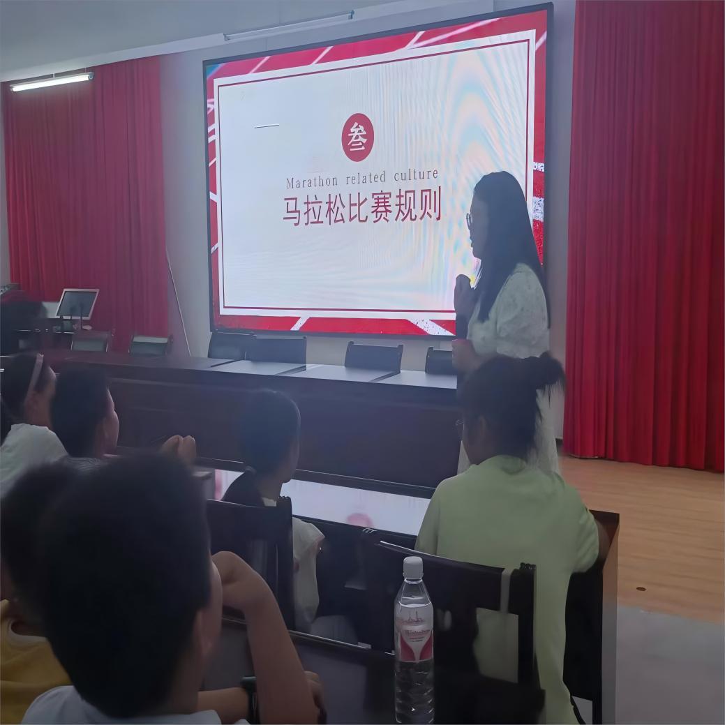 志愿者張文雋面對一群可愛的小孩子,熱情地講解馬拉松知識。通過馬拉松的起源、發展、精神內涵、著名馬拉松賽事以及著名的馬拉松運動員為孩子們普及馬拉松相關的知識。