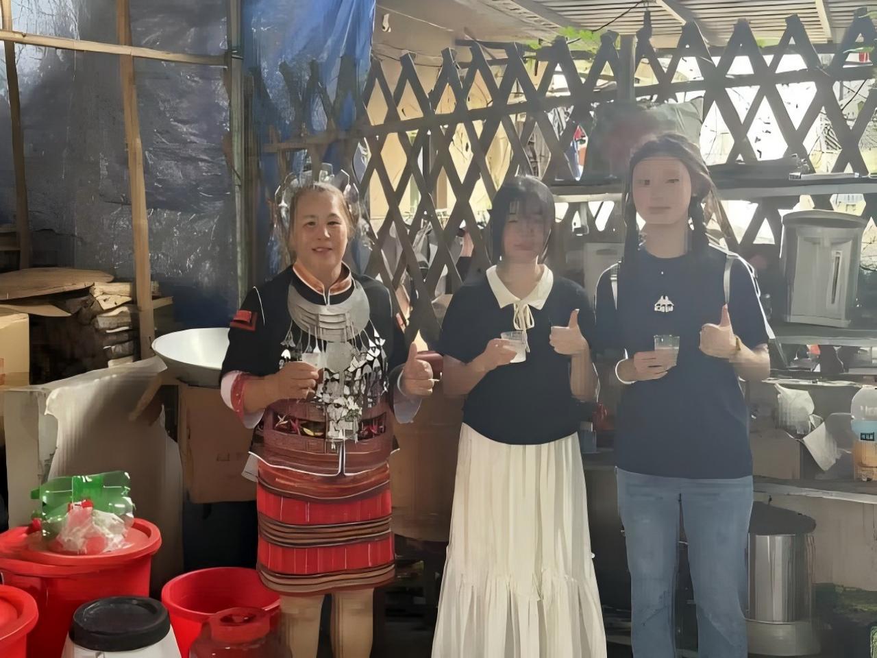 第三站實(shí)踐團(tuán)隊(duì)赴紅毛鎮(zhèn)坎茂村,向并酒釀造技藝傳承人學(xué)習(xí)酒釀知識(shí);赴紅毛鎮(zhèn)草南村,向民歌傳承人學(xué)習(xí)黎錦文化。