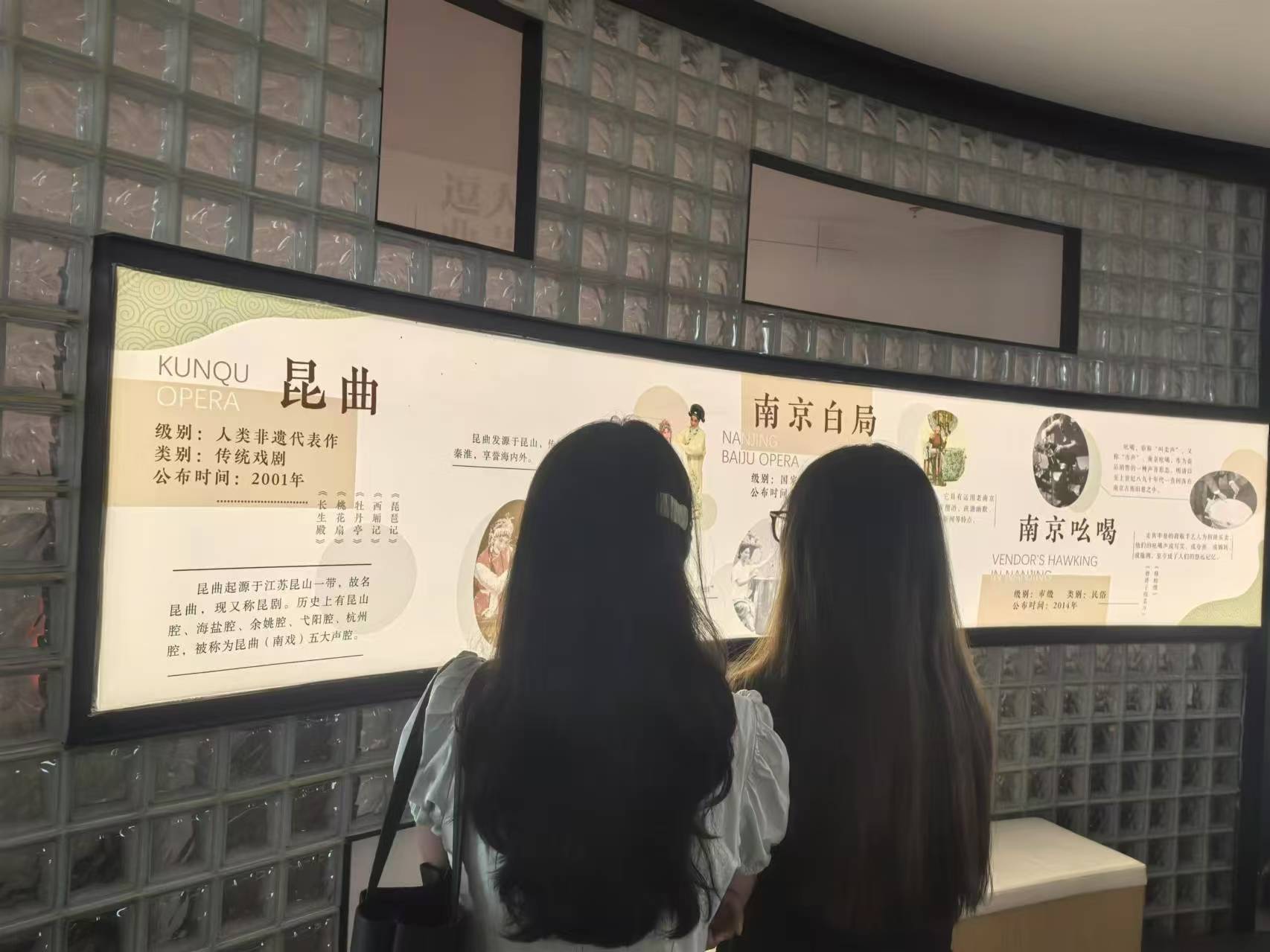 實踐團隊首先來到了主展廳。這里展出了一系列非物質文化遺產項目,從傳統手工藝到民俗表演,每一項都承載著深厚的歷史文化底蘊。其中南京云錦和古琴藝術首先引起了大家的興趣,南京云錦因其“燦若云霞”而得名,館內展示了多件精美的云錦織品,包括皇室御用的龍袍、鳳袍等。這些織品以其繁復的織造技術和獨特的圖案設計,展示了云錦技藝的精湛與獨特。為了展示云錦的制作過程,館內還復原了傳統的大花樓木織機,并邀請傳承人現場演示織造技藝,讓游客直觀感受云錦制作的復雜與精細。