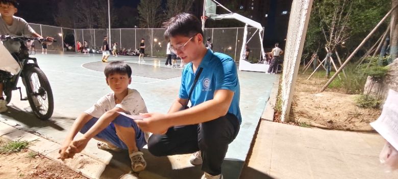 童趣解碼:傾聽幼小心靈的語言初聲踏入歡聲笑語的星城公園,實踐隊員們便融入了一片童真的海洋。在綠茵草地上、游樂設施旁、親子步道邊,隊員們化身“快樂語言引導員”,帶著活潑的笑容和精心準備的互動道具,主動走近嬉戲玩耍、親子同游的孩子們,開啟了一場關于“奇妙聲音”的趣味對話。