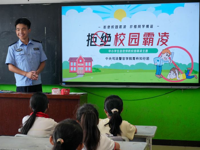 7月11日的“反校園霸凌”課上,情景劇再現“圍堵”“嘲笑”等場景,孩子們喊出“不能這樣做”,成員們結合《中華人民共和國未成年人保護法》的講解,讓“法律保護每一個人”的信念扎根心間。