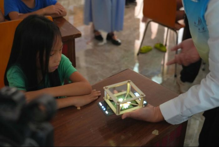 第一堂光學(xué)課《你想成為光嗎?》一開場就牢牢吸引了孩子們的目光——當(dāng)光線透過亞克力板折射形成虛像,一幅幅神奇的立體畫面仿佛懸浮在空中,孩子們驚呼連連,紛紛圍上前去“抓住”空中的圖像。“老師,那個圖像真的在飛!”一個小男孩興奮地喊道,眼中寫滿了驚奇與好奇。