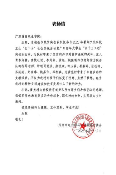 為積極響應(yīng)廣東省“百千萬工程”號召,2025年7月5日至11日,廣東財貿(mào)職業(yè)學(xué)院數(shù)字筑夢隊深入茂名電白區(qū)馬踏鎮(zhèn)黃羌村,聯(lián)合駐馬踏鎮(zhèn)幫鎮(zhèn)扶村工作隊、馬踏鎮(zhèn)黃羌村民委員會、廣東財貿(mào)職業(yè)學(xué)院農(nóng)村科技特派員、北根小學(xué)與土地水小學(xué),開展為期7天共計168小時的暑期三下鄉(xiāng)社會實(shí)踐。以“青春+科技”之力,深入鄉(xiāng)村調(diào)研當(dāng)八地兒童,打造九大特色課程,點(diǎn)亮80余名學(xué)童的暑期課堂,以實(shí)際行動詮釋青年擔(dān)當(dāng)。