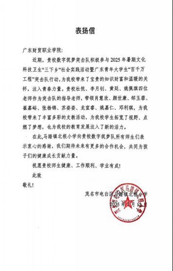 憑借出色的組織能力與扎實(shí)的服務(wù)成果,數(shù)字筑夢隊榮獲馬踏鎮(zhèn)北根小學(xué)與黃羌村委會聯(lián)合頒發(fā)的兩封表揚(yáng)信,充分肯定其在教育幫扶、文化調(diào)研和基層走訪等方面所展現(xiàn)的責(zé)任與擔(dān)當(dāng)。這不僅是一紙榮譽(yù),更是一次對團(tuán)隊精神的高度認(rèn)可。