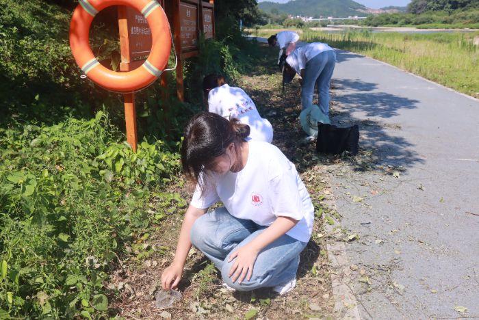 在古樟樹林,隊員們采取分工合作的方式,對游客密集區域的各類垃圾進行了分類處理。并且一些實踐隊員還通過現場講解、示范引導等形式,向游客宣傳“無痕山林”環保理念。