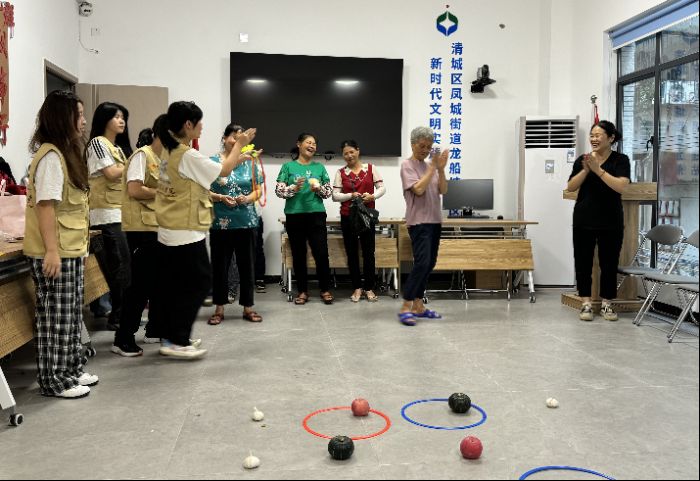 圖為藝路生花文化傳承實(shí)踐隊(duì)隊(duì)員在龍船塘社區(qū)舉辦“果蔬套圈”活動(dòng)