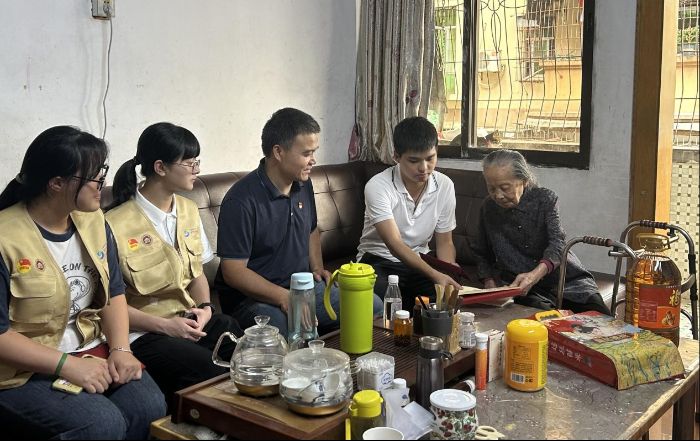 圖為藝路生花文化傳承實(shí)踐隊(duì)隊(duì)員與社區(qū)工作人員探訪許妙桃同志