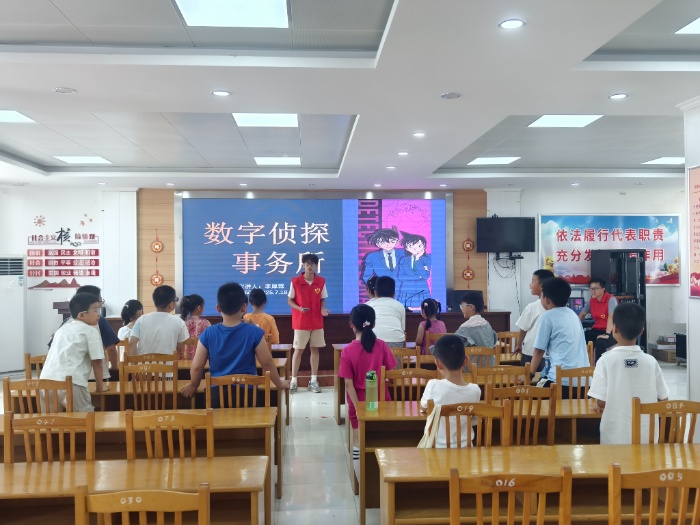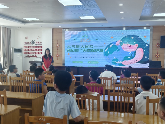 7月18日,小隊(duì)成員在指導(dǎo)老師李天驕的帶領(lǐng)下在揚(yáng)州寶應(yīng)縣開(kāi)展了“宏志少年”暑托班的課程。志愿者設(shè)計(jì)的互動(dòng)游戲像一把鑰匙,打開(kāi)了趣味教學(xué)的大門(mén)。在隨后的“數(shù)字偵探”數(shù)學(xué)課上,志愿者李厚霖和孩子們化身小偵探,通過(guò)“密碼排列”“案件破解”等環(huán)節(jié),在數(shù)字推理中發(fā)現(xiàn)數(shù)學(xué)的邏輯之美;而地球大氣科普課上,“大氣層大冒險(xiǎn)”的動(dòng)畫(huà)演示讓抽象的科學(xué)知識(shí)變得鮮活——當(dāng)志愿者張琳問(wèn)到“如何保護(hù)我們的天空保護(hù)罩”時(shí),一只只小手高高舉起,“少開(kāi)汽車(chē)”“多種樹(shù)”等答案里,藏著孩子們對(duì)自然最純真的守護(hù)欲。