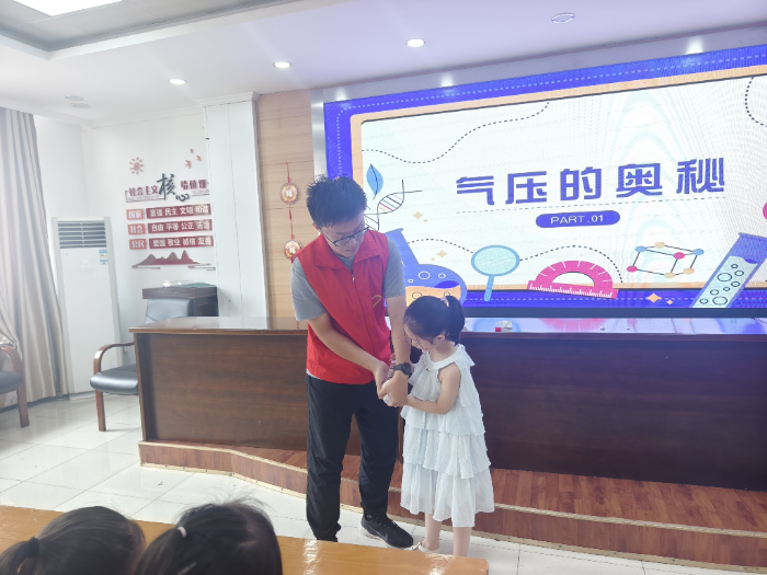 7月19日,小隊(duì)成員在指導(dǎo)老師李天驕的帶領(lǐng)下在揚(yáng)州寶應(yīng)縣開(kāi)展了“宏志少年”暑托班的課程。志愿者李明樂(lè)的物理小實(shí)驗(yàn)課上,孩子們化身“小小科學(xué)家”,沉浸式探索自然的奧秘。在“大氣壓與張力”環(huán)節(jié),當(dāng)看到倒置的礦泉水瓶下,緊貼瓶蓋的乒乓球和紙巾竟能穩(wěn)穩(wěn)托住水流,孩子們紛紛瞪大雙眼,忍不住伸手模仿。孩子們?cè)趧?dòng)手操作中,悄悄揭開(kāi)了摩擦力、密度、靜電等物理原理的神秘面紗。