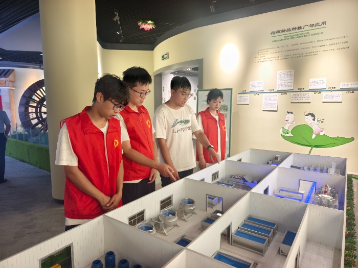 7月16日,團(tuán)隊(duì)前往揚(yáng)州市寶應(yīng)縣,開(kāi)啟了寶應(yīng)荷園的調(diào)研之行,并參觀了荷藕展示館,深入了解當(dāng)?shù)嘏寒a(chǎn)品的發(fā)展史以及特色藕制品的制作工藝。“荷葉羅裙一色裁,芙蓉向臉兩邊開(kāi)”,寶應(yīng)荷園的萬(wàn)畝荷塘既是令人沉醉的詩(shī)意畫(huà)卷,更是當(dāng)?shù)靥厣a(chǎn)業(yè)最生動(dòng)的“活教材”。行程中,團(tuán)隊(duì)乘小船輕劃而入,船槳攪碎水面的倒影,層層疊疊的荷叢在兩側(cè)徐徐展開(kāi),清香漫過(guò)船舷。在荷藕展示館中講解員細(xì)細(xì)道來(lái):這片荷塘不僅孕育著脆嫩得能掐出汁水的鮮藕,更催生出藕粉、藕夾等20余種加工品,每一種都凝結(jié)著當(dāng)?shù)厝舜鄠鞯慕承摹j?duì)員們凝視著傳統(tǒng)工藝?yán)锿钢鴾囟鹊穆ぜ?xì)作,又注視著現(xiàn)代科技下高效運(yùn)轉(zhuǎn)的流水線,真切體會(huì)到 “小藕節(jié)”里藏著的“大產(chǎn)業(yè)”:從田間泥土里的鮮藕,到餐桌瓷盤(pán)里的佳肴;從祖輩手作的老手藝,到科技賦能的新生產(chǎn),這枚小小的藕,早已串聯(lián)起一條貫通古今、充滿活力的產(chǎn)業(yè)鏈。