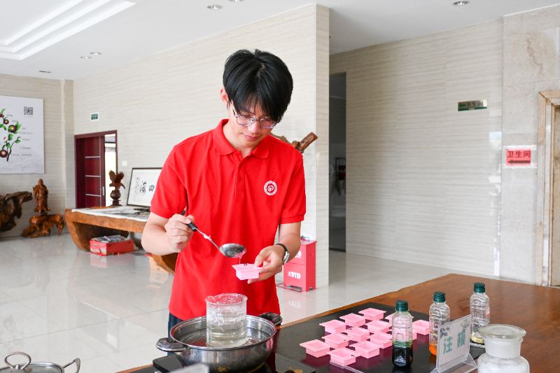 在專業(yè)指導(dǎo)下,實(shí)踐團(tuán)成員們親手參與了天然茶油香皂的制作,體驗(yàn)了傳統(tǒng)智慧與現(xiàn)代工藝的結(jié)合。茶油香皂作為茶油相關(guān)衍生產(chǎn)品,在市場(chǎng)上取得了不錯(cuò)的成績(jī),成員們通過親手制作,對(duì)產(chǎn)品的深加工有了初步的了解。