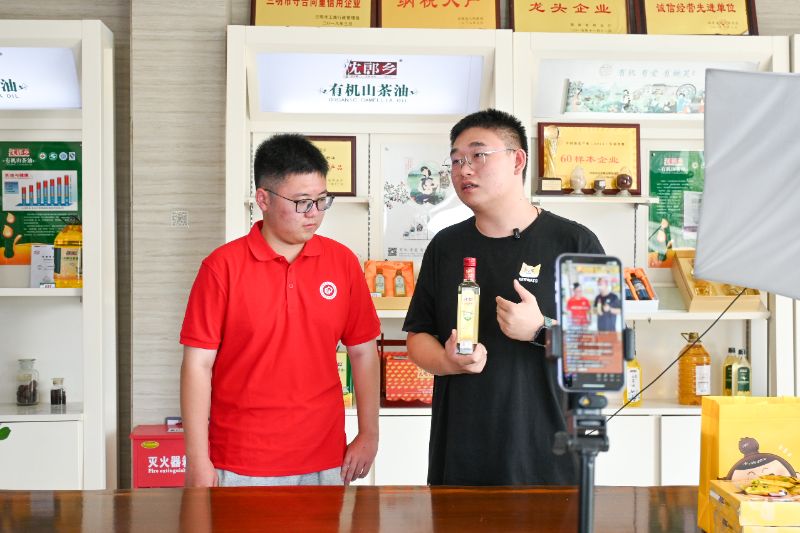 在公司營(yíng)銷部經(jīng)理羅武濤的指導(dǎo)下,團(tuán)隊(duì)成員化身“帶貨新人”,學(xué)習(xí)直播話術(shù)與運(yùn)營(yíng)技巧,切身感受新業(yè)態(tài)對(duì)農(nóng)產(chǎn)品“出圈”的強(qiáng)勁推力,并在“沈郎鄉(xiāng)”抖音賬號(hào)上實(shí)際體驗(yàn)了一次直播帶貨,與觀眾互動(dòng)、推廣茶油產(chǎn)品,上了一堂生動(dòng)的現(xiàn)代營(yíng)銷實(shí)戰(zhàn)課。團(tuán)隊(duì)成員在實(shí)踐中體驗(yàn)了茶油產(chǎn)品從生產(chǎn)端走向消費(fèi)端的最后一環(huán),也深刻感受到電商直播在拓寬農(nóng)產(chǎn)品銷售渠道、提升品牌影響力方面的重要作用。