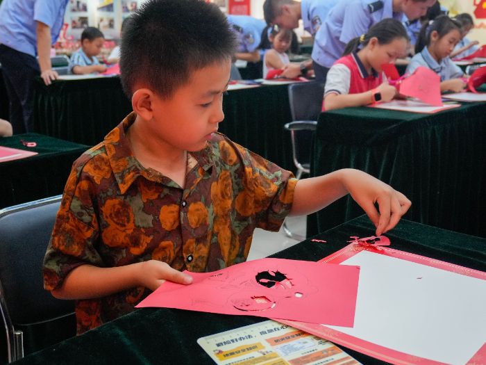 圖為孩子們體驗非遺剪紙(周緣圓 張境軒供圖)