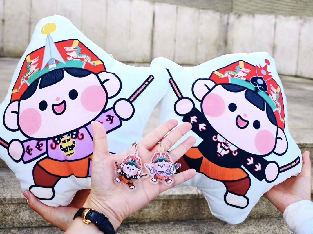 原創(chuàng)甲子英歌舞IP形象,開發(fā)了英歌舞人偶抱枕、鑰匙扣、便簽等一系列