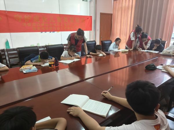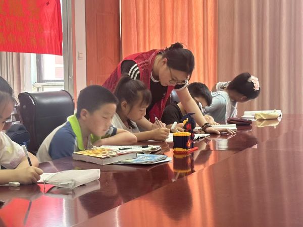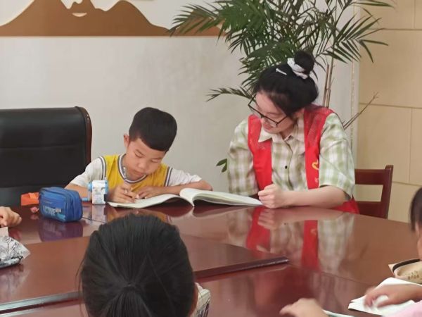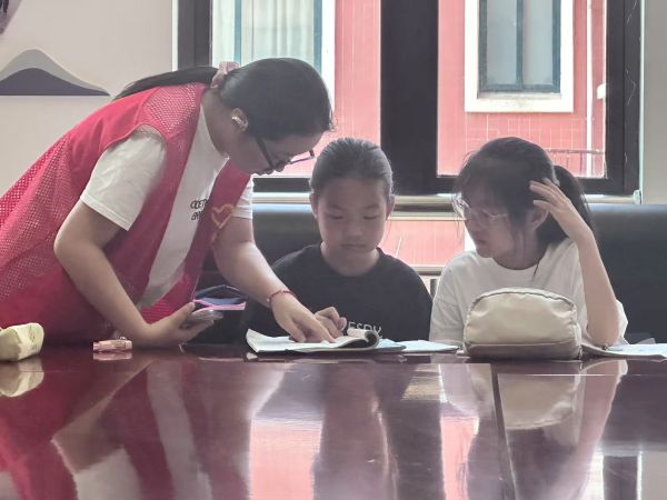 從容應隊隊員對孩子們進行暑假作業輔導,對孩子們不會寫的題目進行一對一的系統性輔導。