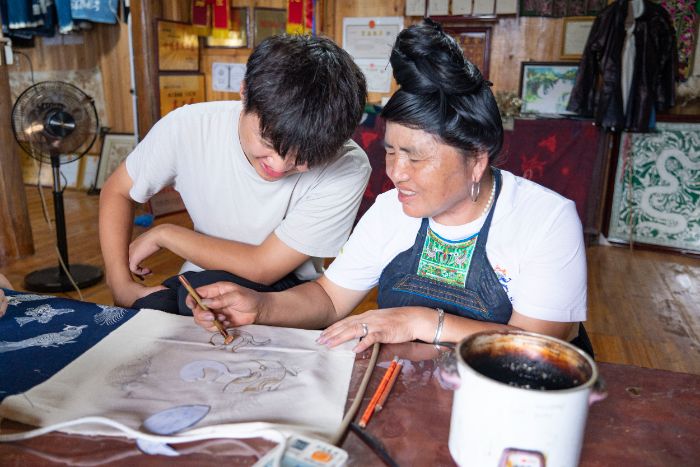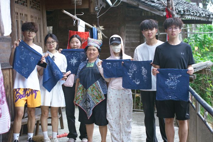 非遺傳承:觸摸蠟染的文化溫度離開村超賽場,實踐團(tuán)走進(jìn)擺貝村姜老本蠟染刺繡手工作坊,開啟非遺探尋之旅。成員們跟著姜老本師傅學(xué)習(xí)蠟染技藝,從握筆勾勒到熔蠟、點蠟,再到浸染、去蠟,每一步都體現(xiàn)著對傳統(tǒng)技藝的敬畏。“以蠟為界,以染為色”,姜師傅演示時的熱忱,讓大家體會到這門千年技藝的重要性 —— 它既是苗族文化的基因密碼,也是村民增收的 “指尖財富”。