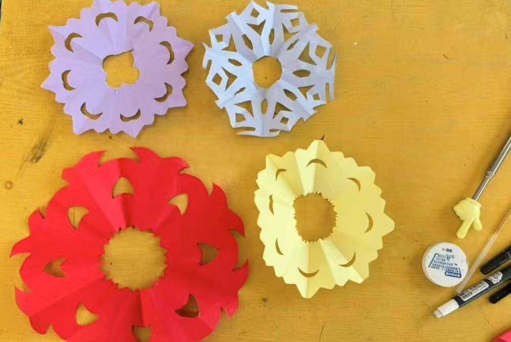 第二節課是剪紙課,老師先簡單介紹了剪紙的歷史和文化背景,隨后讓孩子們從折紙開始體驗。孩子們先是感受紙張的質感和韌性,接著嘗試在折好的紙上描畫簡單圖案,再沿著線條慢慢裁剪。過程中,不少孩子遇到了困難:有的因為折痕位置不對,剪出來的圖案斷開了;有的因為剪刀使用不熟練,作品邊緣顯得粗糙,甚至出現破洞。面對這些問題,老師沒有催促,而是蹲在孩子身邊,手把手地教他們如何控制剪刀的力度和走向,如何讓線條更流暢。在反復嘗試后,孩子們的作品漸漸有了模樣,雖然不算完美,卻都是獨一無二的。通過這節課,孩子們不僅學會了簡單的剪紙技巧,更在一次次調整中體會到了堅持的意義。