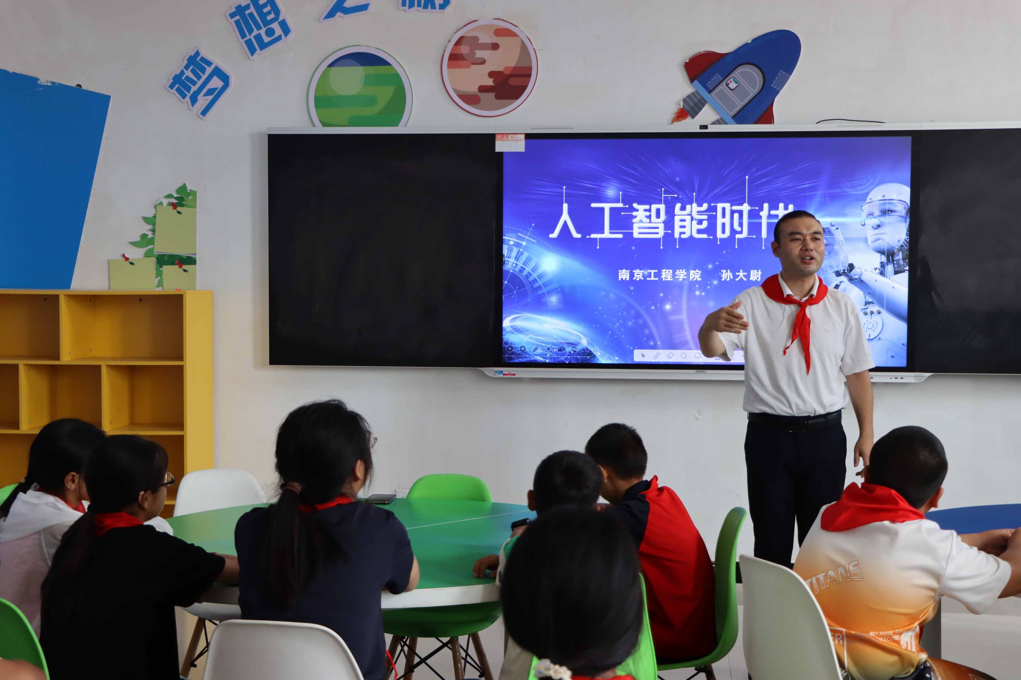 圖為南京工程學院選派駐泗洪縣的鄉村振興掛職干部為孩子們講解人工智能的發展
