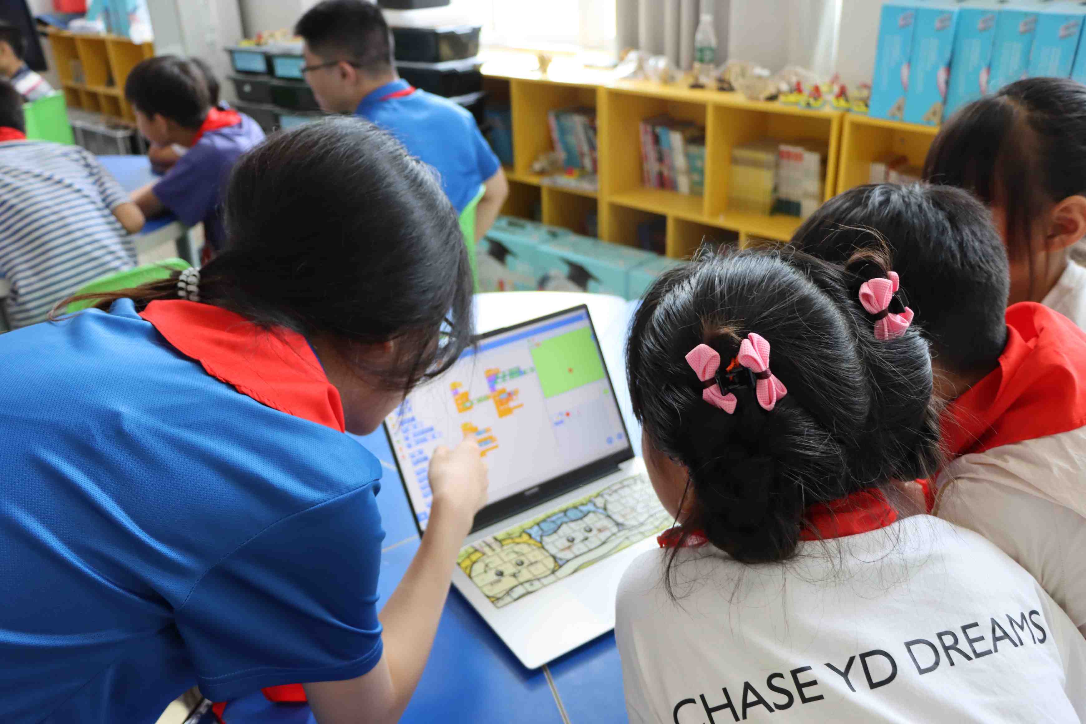 圖為實踐團成員指導孩子完成Scratch編程任務