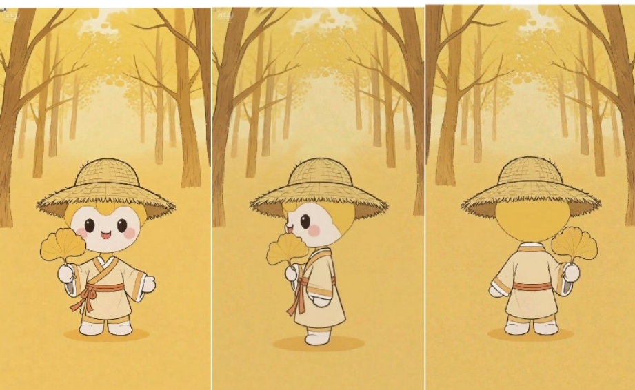 重坊鎮擁有柳編非遺技藝,通過與團委的交流,隊員們得知當地帽子產業頗具規模,因此文創部隊員結合銀杏葉、柳編技藝的草帽為當地設計了特色的文化IP形象“杏福小子”黃色的古代衣衫搭配著可愛的卡通人物形象,手中拿著代表性的銀杏葉,頭上戴著柳編草帽,迎合了當地的特色產業與景觀元素,受到了政府的采納與認可。
