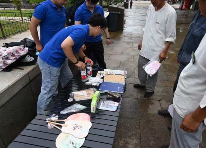 實踐隊員們搖身一變,成為中華文化的“傳播使者”。他們精心策劃并制作了一系列獨具特色的宣傳物品,免費發(fā)放給游客。以非遺元素為設計靈感的扇子,為游客在炎炎夏日帶來一絲清涼的同時又能領略和傳播中華傳統(tǒng)文化之美;更有繪制著盛唐風情的環(huán)保筆記本,承載著環(huán)保理念與古城記憶,在游客手中傳遞。這些充滿創(chuàng)意的小物件,宛如無聲的使者,呼吁每一位到訪者在領略盛唐輝煌的同時,更好的傳播和保護中華文化。