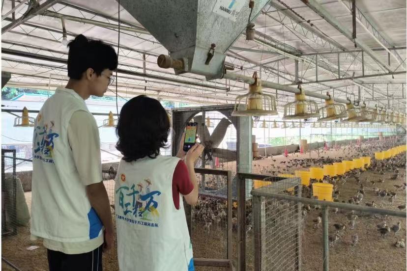 圖為實(shí)踐團(tuán)成員在咨詢養(yǎng)殖農(nóng)戶特色雞養(yǎng)殖的心得。許向一 供圖