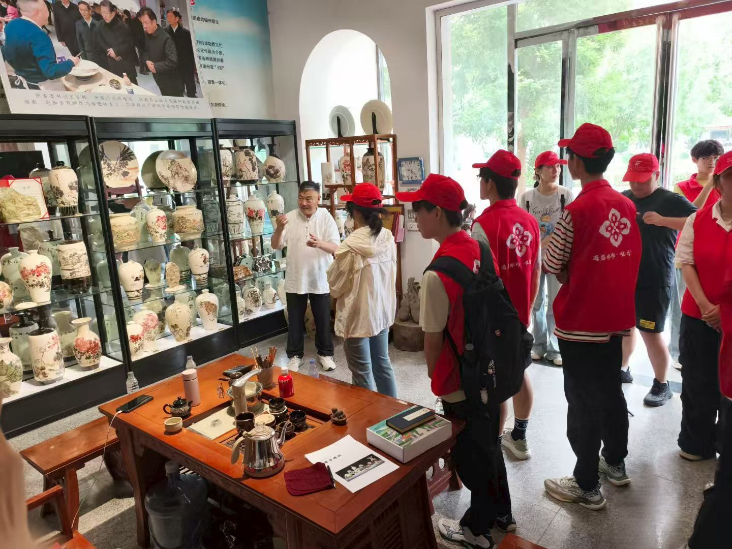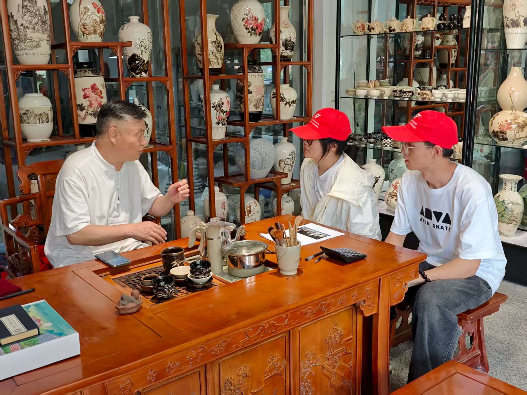 為探尋磁州窯傳承新路徑,團(tuán)隊(duì)走訪省級(jí)非遺傳承人趙振宇父子的工作室。父子二人作為當(dāng)代磁州窯傳承的中堅(jiān)力量,以“老手藝說新話”詮釋傳承,在堅(jiān)守核心技藝的基礎(chǔ)上大膽革新:精簡(jiǎn)72道傳統(tǒng)工序以適配當(dāng)代節(jié)奏;將生肖文化、國(guó)畫技藝融入設(shè)計(jì);經(jīng)窯洞數(shù)百次試燒,實(shí)現(xiàn)瓷面水墨效果;以堆雕讓紋飾立體,并用石頭造型打破器型桎梏。趙師傅多次強(qiáng)調(diào):“要不斷學(xué)習(xí)新思想,把磁州窯歷史揉碎融入心中,創(chuàng)造與時(shí)代結(jié)合的新磁州窯。” 他為隊(duì)員們細(xì)致講解每件瓷器的設(shè)計(jì)靈感與技藝細(xì)節(jié),讓大家在贊嘆中感受到文化傳承的溫度。