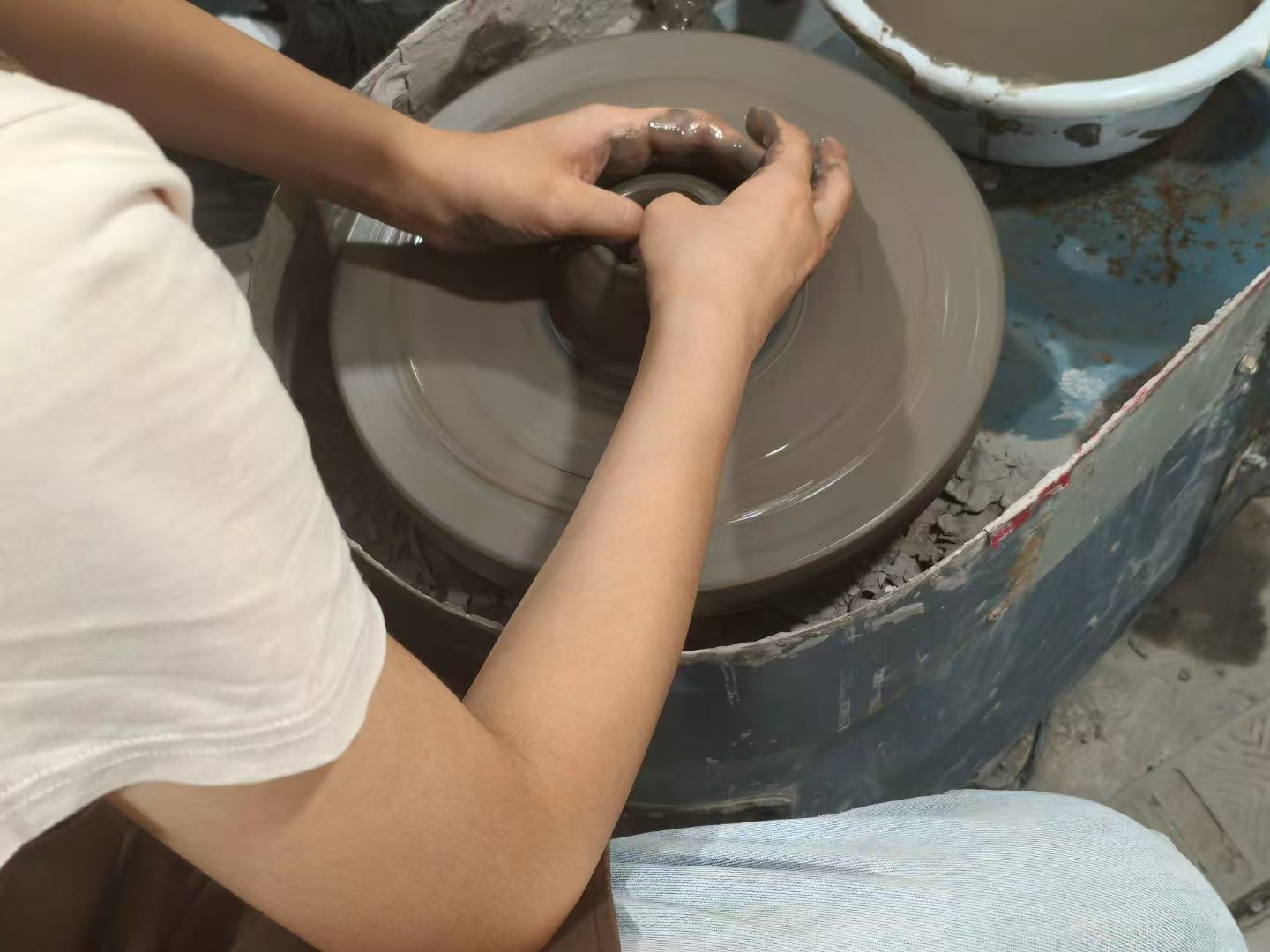親身體驗(yàn)環(huán)節(jié),團(tuán)隊(duì)前往彭城異品坊嘗試?yán)鳌T趲煾抵笇?dǎo)下,隊(duì)員們牢記 “掌心托底、均勻上推” 的要領(lǐng),雙手沾滿陶泥控制旋轉(zhuǎn)的坯體。這項(xiàng)看似簡(jiǎn)單的技藝實(shí)則難度極大,需保持手部穩(wěn)定與力度均勻,稍有偏差坯體便會(huì)變形。經(jīng)過多次嘗試,團(tuán)隊(duì)成員成功捏制出自己的陶瓷器具,雖成品稚嫩,但大家對(duì)匠人的精湛技藝更添敬佩。