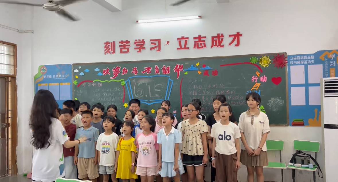 美育潤心:涵養(yǎng)文化根脈,繪就鄉(xiāng)村新顏 隊員化身書法老師,從握筆到筆畫細致指導,讓孩子們在墨香中感受漢字韻味,悄然厚植文化自信。結合“綠水青山”理念開展的創(chuàng)意樹葉畫課程,引導孩子們以落葉為材,將梧桐葉化作蝶翅、銀杏葉變作魚尾,創(chuàng)作30余幅生態(tài)畫作,在變廢為寶中播撒環(huán)保種子。音樂課堂上,《歌唱祖國》的旋律反復回蕩,隊員逐句教唱,稚嫩歌聲里凝聚著集體榮譽感與愛國情懷。師生共同創(chuàng)作的“校園文化手印樹”,以紅橙黃綠的掌印交織成枝繁葉茂的圖景,既成為獨特校園風景,更凝聚起鄉(xiāng)村成長的集體記憶,讓美育之力浸潤鄉(xiāng)村文化肌理。