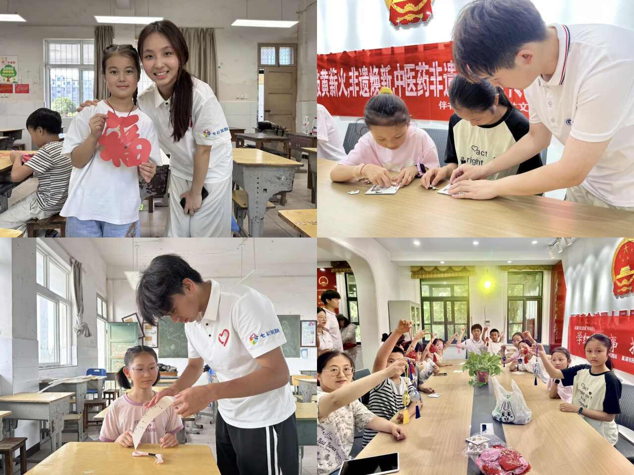 文化是民族的根脈,亦是民族的靈魂。實踐團以峏山楊中醫藥、唐馬小調、巢湖民歌等地方文化為依托,融入剪紙等非遺技藝,開展系列文化教育活動,讓地域文脈在孩子們心中扎根。“峏山楊”文化展示中,PPT動畫、典故講解結合民謠課堂、藥材拼圖與香囊制作,讓孩子們在互動中觸摸中醫智慧與非遺技藝;“指尖非遺”課堂上,剪刀裁出“福”字等圖案,傳統剪紙煥發生機;同時聯合“懿本圖”實踐團,通過對麥秸畫及樹雕畫的講解,讓孩子們感受非遺活力。從傳統醫藥到剪紙技藝,從民俗到非遺故事,這些文化養分悄然播下傳承種子,讓地方特色代代相傳、生生不息。