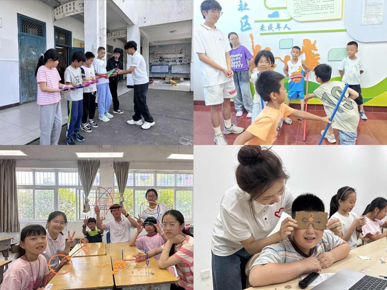 素質教育是孩子全面發展的關鍵,實踐團立足身心素養培育,以多元活動助力全面發展。感統訓練中,“導管遞球”“趣味沙包”“不倒森林”等項目,在成員的示范與引導下,孩子們于反復實踐中增強身體協調性,深悟專注與配合的要義,綜合素質得以有效提升。科技與創新課堂上,實踐團通過原理講解與VR眼鏡手工制作,引導青少年將光學知識轉化為立體視覺體驗,于虛實交融間領略科技之奇;“小吸管搭世界”活動中,成員們則以吸管為教具引導學生探索結構力學,孩子們分組協作搭建創意作品,在實踐中同步提升創新思維與團隊協作能力。