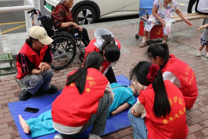 活動內容豐富多樣。啟動儀式上,張莊村書記致歡迎辭并介紹村落概況,學院老師闡述活動目的與服務內容,全體人員合影留念。義診服務環節,2名醫師坐診,開展中醫科和生殖科等的相關服務診斷,其中村民前往中醫科診斷的人絡繹不絕,對村民的吸引力很大,6名實踐團成員輔助測量血壓、血糖,為村民提供基礎健康篩查與咨詢。急救實操教學中,醫生帶領3名醫學生用模擬人演示心肺復蘇、海姆立克急救法,邀請村民現場練習,村民們掌握了基本的急救方法。
