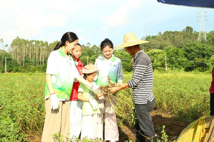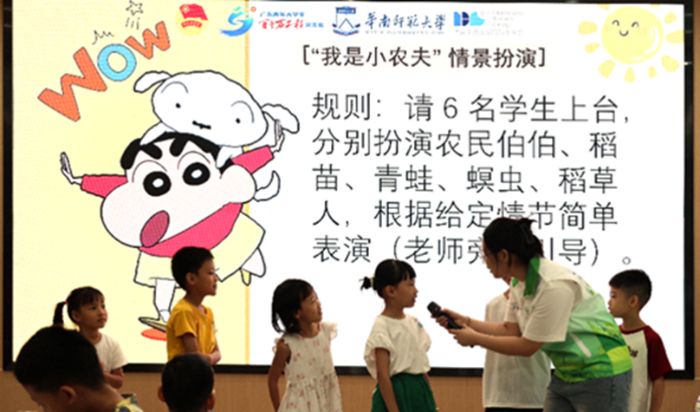 農耕文化系列課程的設計和開發,對設計的研學課程進行落地,在惠州博羅黨群服務中心和承糧陂村開展理論實踐課堂。理論課堂上,隊員們開展《米飯成長記》繪本閱讀課,講述了水稻從育種、插秧到抽穗、收割的生命周期,使孩子們理解“粒粒皆辛苦”的含義;設計“我是小農夫”情景表演,學生分別扮演稻苗、青蛙、螟蟲和稻草人等角色,了解農田生態系統;進行“稻谷繪豐年”活動,提高學生美育和創造力。
