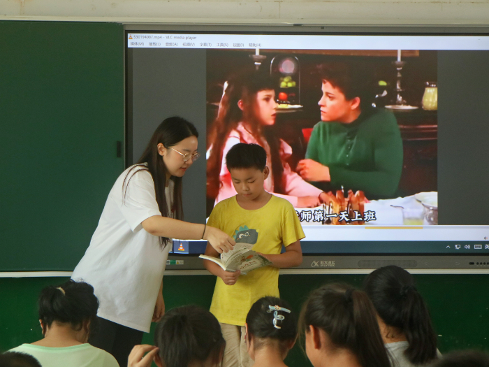 “冀翼童心”社會實(shí)踐團(tuán)隊(duì)依托成員專業(yè)特長,為留守兒童開展系列沉浸式、互動式小課堂。播音課上,團(tuán)隊(duì)成員帶領(lǐng)孩子練口部操、進(jìn)行模擬主持,幫助孩子改善發(fā)音、提升表達(dá)自信;手工實(shí)踐注重操作能力與創(chuàng)造性思維培養(yǎng),以手繪扇子為主題,讓孩子在涂色創(chuàng)作中釋放創(chuàng)意;舞蹈課上,成員耐心拆解動作,指導(dǎo)孩子學(xué)習(xí)舞蹈,有效提升了學(xué)生的肢體協(xié)調(diào)能力與藝術(shù)感知素養(yǎng);影視鑒賞環(huán)節(jié)聚焦價(jià)值觀與審美教育,通過具有積極意義的影片,幫助學(xué)生理解敘事藝術(shù)中所蘊(yùn)含的情感結(jié)構(gòu)與人文精神,切實(shí)將語言表達(dá)、藝術(shù)感知、創(chuàng)意實(shí)踐融入課堂。