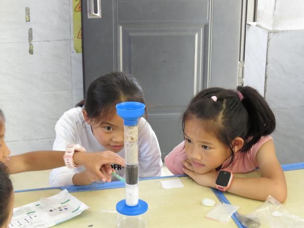 圖2支教團(tuán)成員帶領(lǐng)學(xué)生做污水凈化實驗