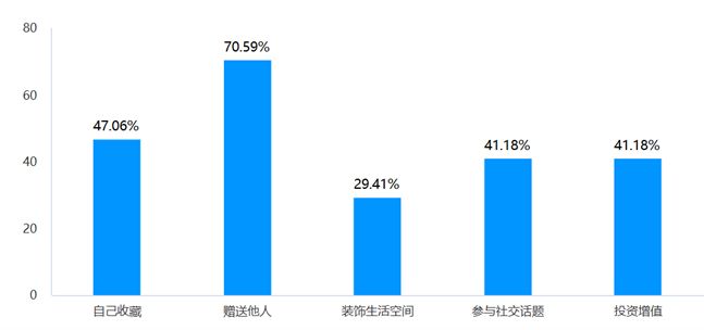 在消費行為方面,Labubu的“社交貨幣”屬性十分凸顯,57.49%的消費者通過社交媒體了解該產(chǎn)品,35.33%受朋友推薦影響。購買目的中,70.59%的消費者將其作為禮品,47.06%用于個人收藏,41.18%看重投資增值潛力。