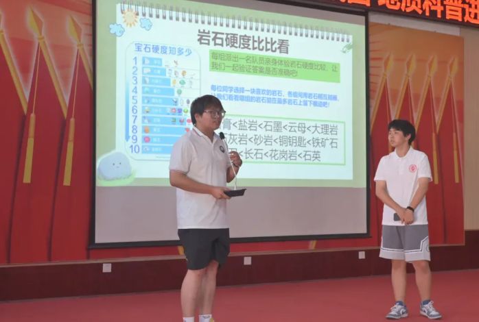 圖為實踐團成員教手語課+徐家齊攝 “石頭會唱歌”地質課上,實踐團充分發揮地學專業優勢,把抽象科學轉化為可觸可感的體驗:先通過動畫講述“巖石的一生”,勾起孩子們的好奇心;再開展“巖石硬度挑戰賽”,指導孩子們分組用鹽巖、石墨、花崗巖等相互刻畫,在觀察劃痕中同步講解并引導驗證“鹽巖<云母<石英”的硬度規律。看著孩子們手持放大鏡,模仿小地質學家研究巖石紋理,認真聆聽團隊成員解讀“石頭里的地質奧秘”,實踐團深刻感受到,大家作為一個團隊用專業知識將普通石塊轉化為鑰匙,成功為鄉村兒童點燃了探索自然的科學夢想。托地球物理專業特色,實踐團以“地脈勘探”為抓手,將專業知識與鄉村需求結合,在觀光棧道調研與地質實操中,為古將村發展注入專業力量。