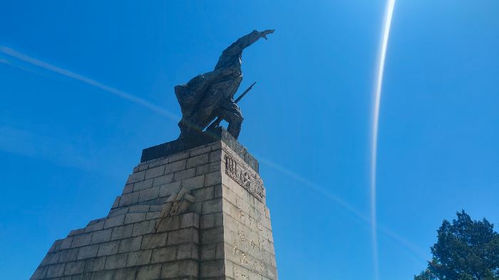眼前的群雕甫一入目,便以撼人的力量撞入心底,那股穿透時空的沖擊力讓周遭的喧囂瞬間沉寂。戰(zhàn)士們的姿態(tài)鮮活如臨戰(zhàn)場:有的半蹲屈膝,雙手緊握鋼槍,指節(jié)因用力而微微泛白,堅毅的神情里藏著不破敵軍誓不還的決絕;有的昂首佇立,目光如炬般穿透天際,仿佛正凝視著遠方?jīng)_鋒的號角,眉宇間凝結(jié)著對勝利的渴望與對家國的守護。恍惚間,硝煙似從雕塑底座緩緩升騰,耳畔似響起槍炮的轟鳴與戰(zhàn)士們的吶喊,讓人分不清是藝術(shù)的還原,還是歷史的回響。